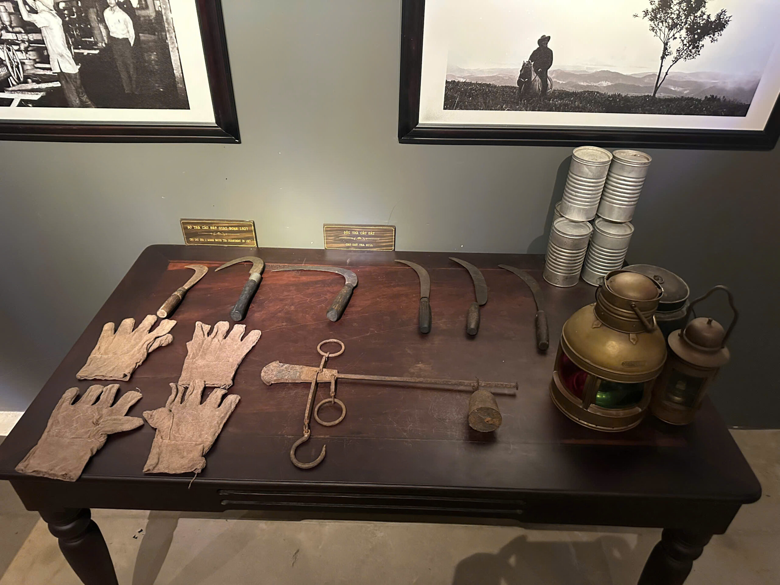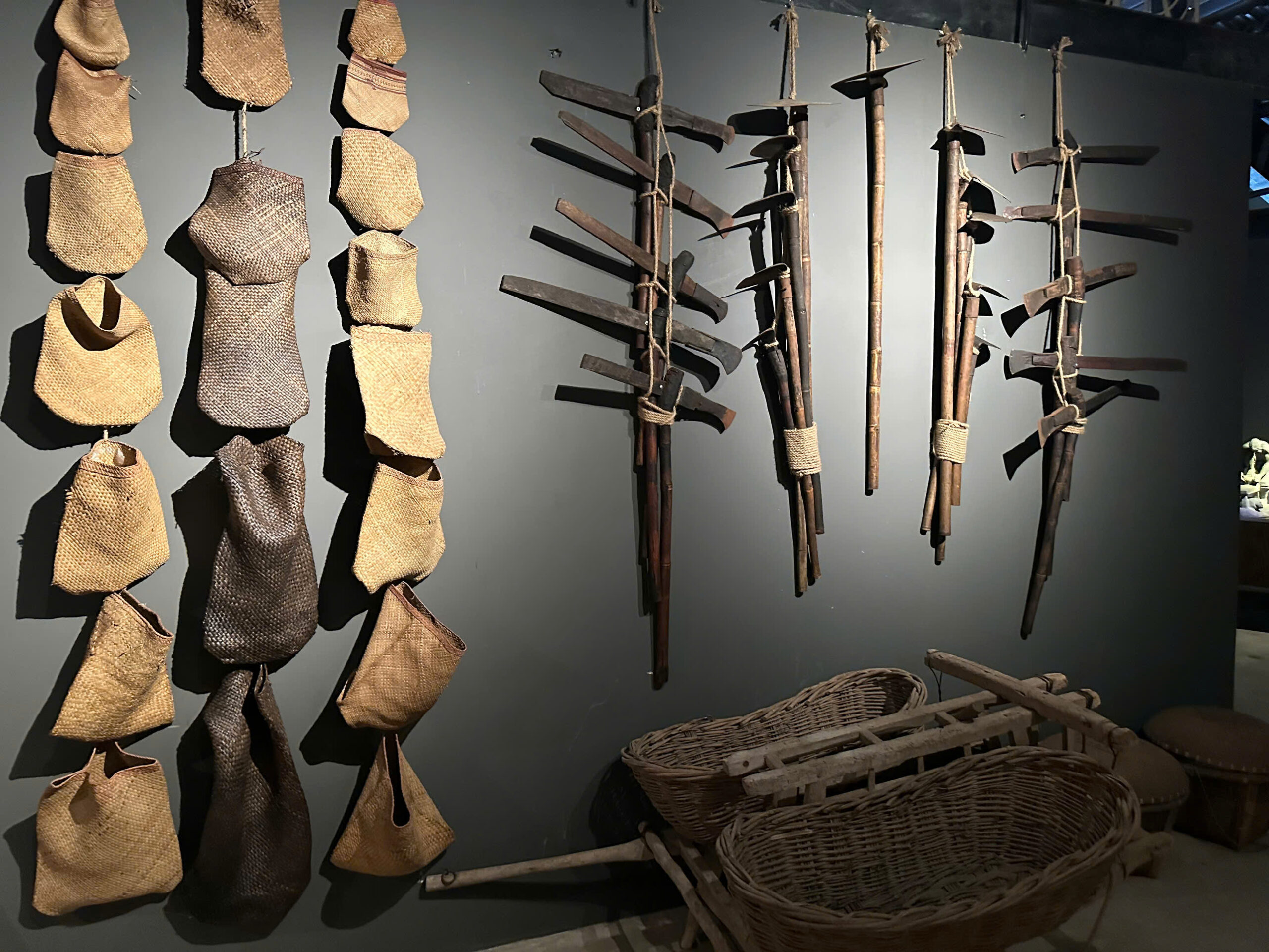 Nông cụ thô sơ gồm các túi đựng cơm, gùi trà, nón lá, nia..gầu múc nước, xe đẩy, bồ trà, rương đựng bảo quản trà